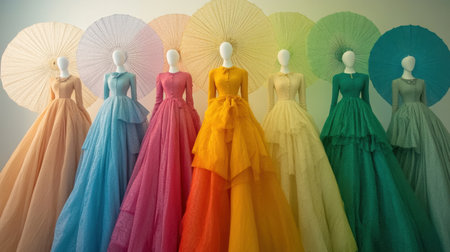 A captivating arrangement of colorful dresses displayed on mannequins, paired with elegant parasols, highlighting the latest trends in fashion and textile design.