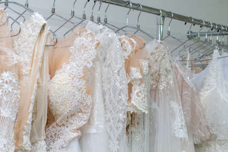 White and cream wedding dresses on a hanger in a bridal boutique. close up.