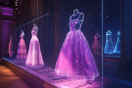 Stunning dresses displayed in glass cases blend artistry with technology in a contemporary exhibition setting.