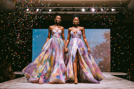 Models walk hand in hand down the runway colorful wearing gowns. Event held indoors with decorative confetti adding festive atmosphere. Concept of fashion design, runway shows, event marketing.