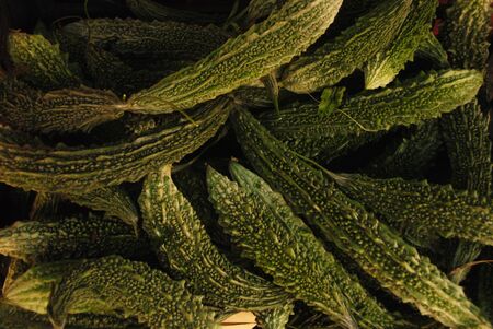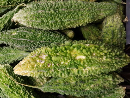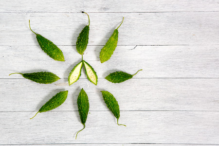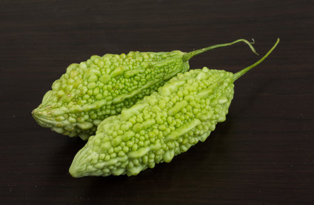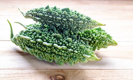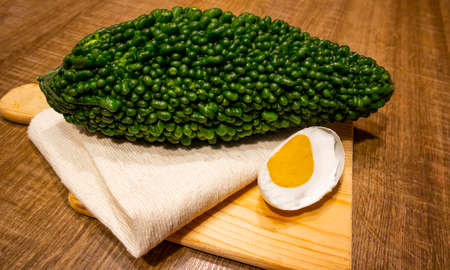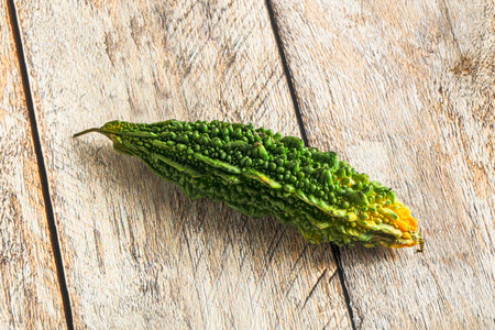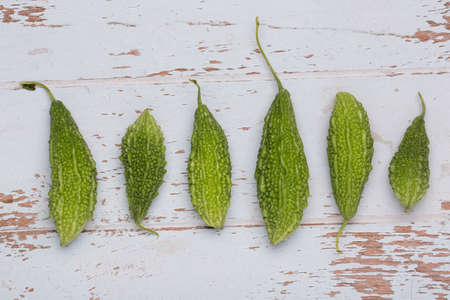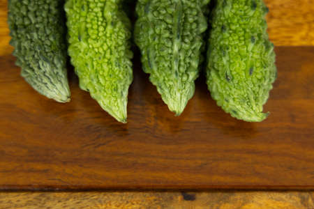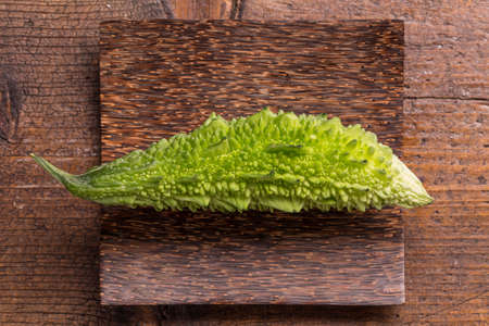 Wild bitter gourd or bitter cucumber on a rustic wooden background. Rich in sources of antioxidants helps to reduce risks for a number of health issues.