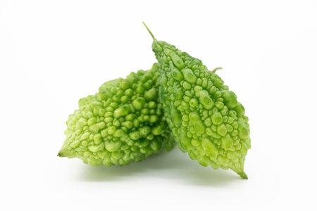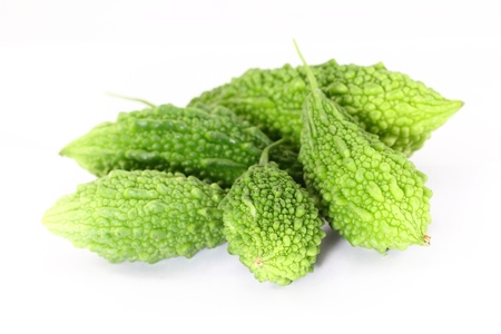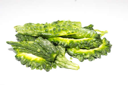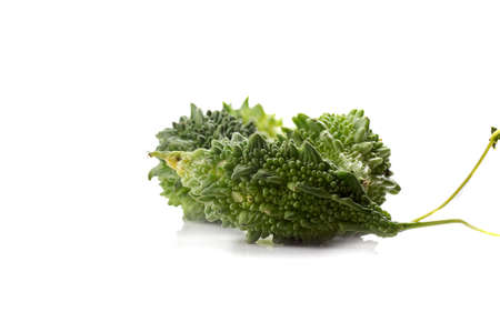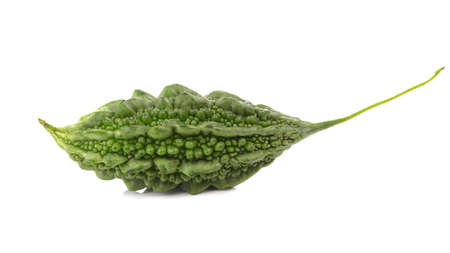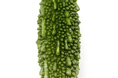 Bitter gourd, rough, green, organic, edible and herbal, with a bitter taste on a white background.