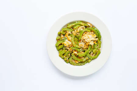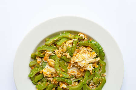 Stir-fried egg with bitter melon on a white dish on white background. Copy space