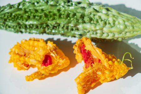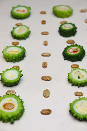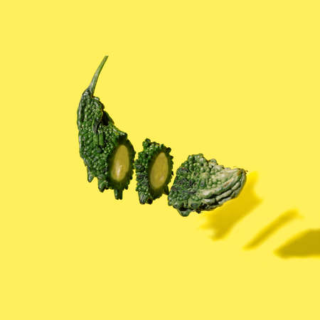 fresh bitter gourd fruit and bitter gourd fruit with half on wooden background