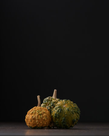 Green decorative pumpkins on rustic wooden background, selective focus.