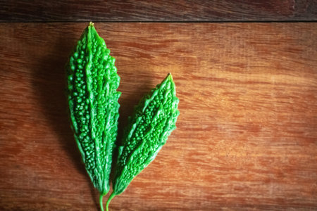 Fresh and green bitter gourd vegetable kept on a wooden table with copy space