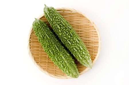 Goya, Bitter Melon in Bamboo Sheeve on White Background