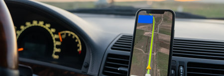 Navigation auto map system. Global positioning system on smartphone screen in auto car on travel road. GPS navigation with smartphone application system