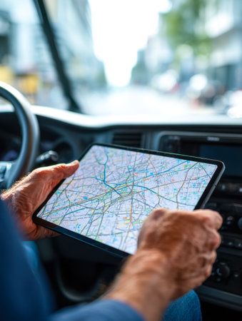 A commuter concentrates on a sleek digital guide as city traffic flows around, capturing a moment of modern travel amidst urban vibrancy.