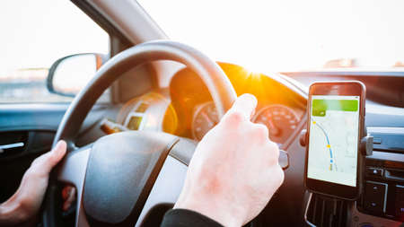 Modern driver using online maps and GPS applications with smartphone. Navigation system