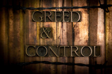 Greed and Control text formed by real authentic typeset letters with barbed wire on vintage textured grunge copper and gold background