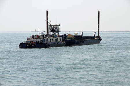 ship with excavator for dredging the entrance to the port