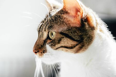 Closeup portrait of cute adorable tabby cat with stripes and green eyes sitting looking away. Domestic pet indoors at home. Toned with vintage retro modern hipster film filters, lifestyle.