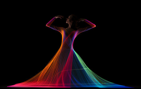 This artistic image features a woman's profile made of colorful, flowing strands symbolizing beauty and creativity against a dark backdrop.