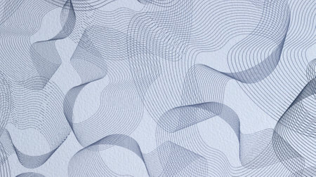 An abstract composition features a flowing wave-like structure composed of numerous parallel lines. The image showcases a blend of cool colors, predominantly blues and whites, with a subtle gradient effect. The design suggests a digital or scientific context. Suitable for graphic design or conceptual presentations.