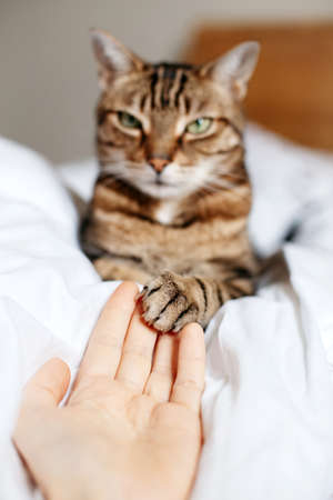Man giving open empty hand palm to tabby cat. Woman touching cats paw as sign of support, compassion and care. Relationship friendship of human and domestic feline animal pet.