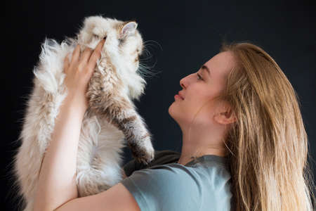 A young pretty blonde girl is holding a Persian cat on her outstretched arms and they looking at each other. The girl looks at her cat with a smile.