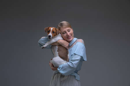 young woman loves her puppy and gives a kiss (focus on kissing mouth)