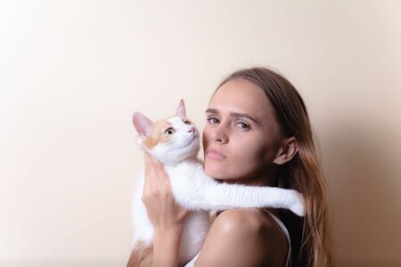 Candid portrait of Young woman is resting with kitten on the bed at home one sunny day. Girl play with outbred kitten.