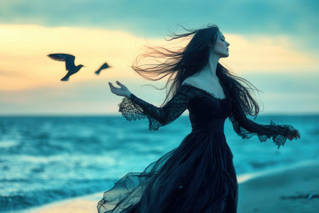 Singer wearing elegant black dress posing on the beach at sunset