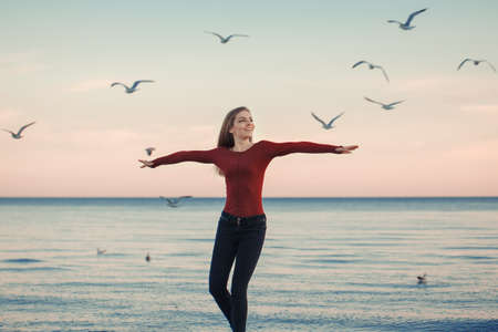 portrait of happy smiling laughing excited Caucasian young woman in jeans running jumping among seagulls birds on autumn fall day outdoor on the shore beach at sunset, lifestyle natural emotion