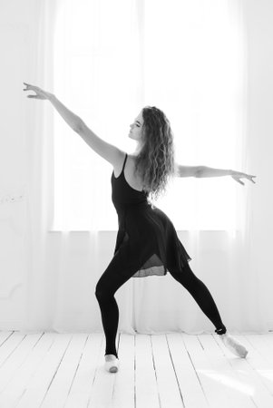 Girl ballerina with curly hair. Black and white photo. BW