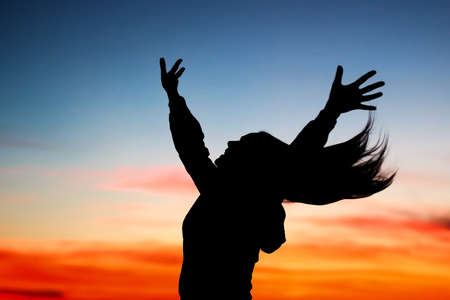 silhouette standing with both hands raised and sunset