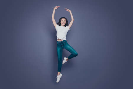 Graceful adorable pretty stylish trendy nice lovely cheerful curly-haired brunette girl in casual white t-shirt and jeans, fooling, flying in air, dancing like ballet, isolated on grey background
