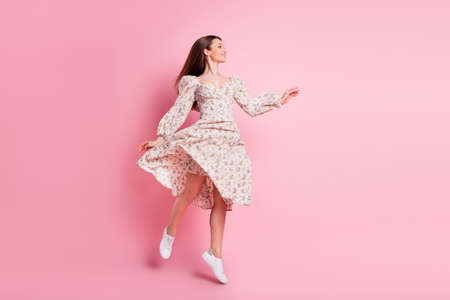 Full length body size photo pretty girl dancing jumping up in summer looking copyspace dreamy isolated pastel pink color background