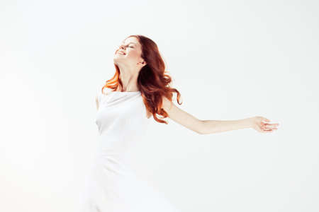 Woman on a light background in white clothes makeup red hair model