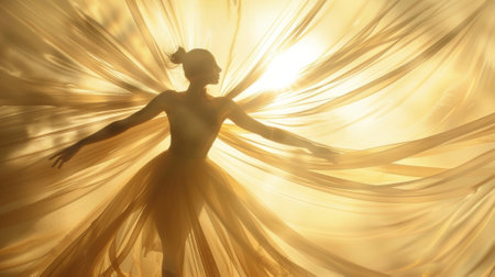 A graceful ballet dancer surrounded by floating tulle ribbons