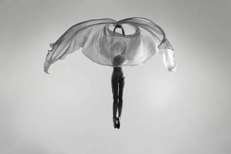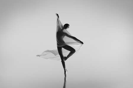 Black and white portrait of graceful ballerina dancing with fabric, cloth isolated on grey studio background. Grace, art, beauty concept. Weightless, flexible.