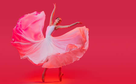 elegant ballerina in pointe shoes dancing in a long white skirt on red background
