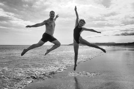 silhouettes of jumping people on low horizon with blurred background in black and white photo