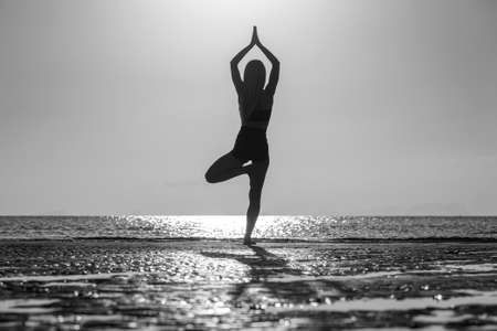 Silhouette of woman standing at yoga pose on the tropical beach during sunset. Caucasian girl practicing yoga near sea water. Black and white