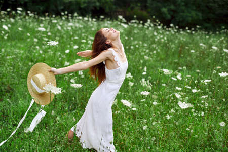 pretty woman walking in the field flowers freedom nature