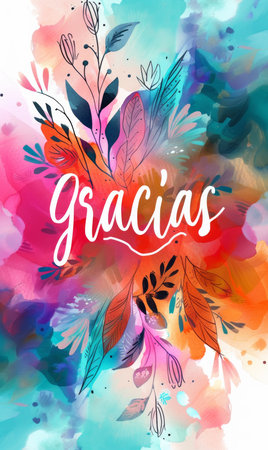 Gracias - Thank you in Spanish language. Modern calligraphy lettering text on multicolored watercolor paint splash background.