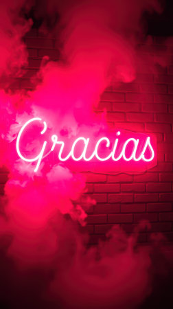Bright pink neon sign with the word Gracias surrounded by colorful smoke at a nightlife venue