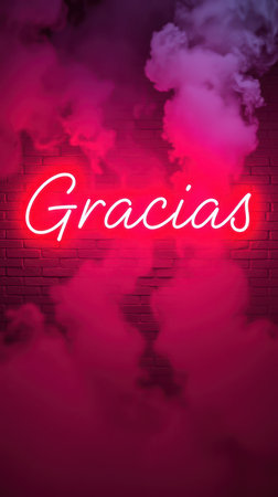 Neon sign glowing with the word gracias amidst pink smoke in an urban setting at night