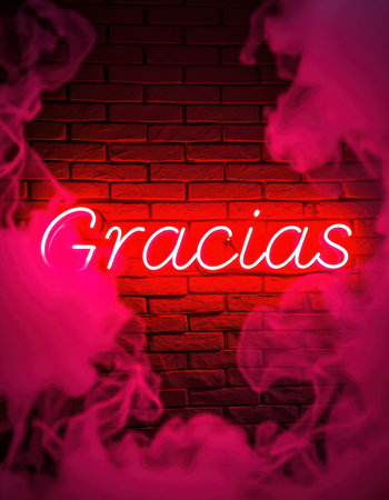 Neon sign reading Gracias illuminated against a brick wall with pink smoke in a lively urban setting