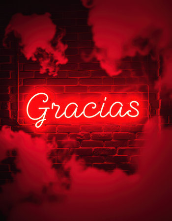 Bright red neon sign displaying the word Gracias against a smoky background in a modern urban setting