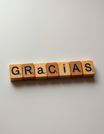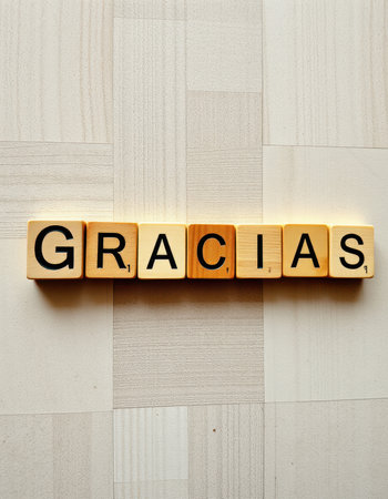 Wooden letter tiles spell gracias in a creative arrangement on a smooth surface