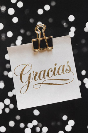 A white note with the word Gracias written in elegant script is clipped with a gold binder clip.