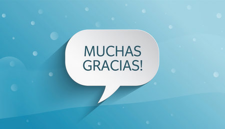 A white speech bubble centered on a blue gradient background with subtle white speckles and faint cloud shapes. Inside the speech bubble, the words MUCHAS GRACIAS! are clearly written in dark letters. The bubble has a soft shadow, creating a slight depth effect, conveying gratitude or appreciation.