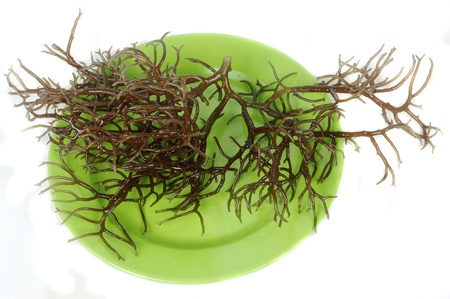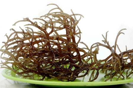 fresh brown seaweed on a green plate isolated on white background