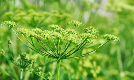 Summer. Dill blooms in the garden of a country house. Dill inflorescence.