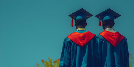 Two graduates in caps and gowns celebrating their success at a graduation ceremony. Concept Graduation, Success, Caps and Gowns, Celebration, Proud Achievements