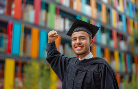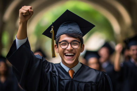 A joyful young graduate raises his fists in triumph, wearing a cap and gown. He is surrounded by fellow graduates, celebrating a significant academic achievement on a sunny day.