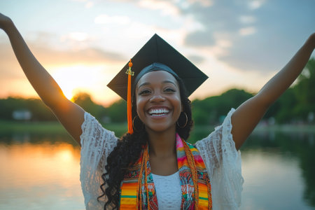 A young woman joyfully celebrates her graduation at sunset by a serene body of water, wearing a graduation cap and colorful traditional attire, smiling with arms raised.