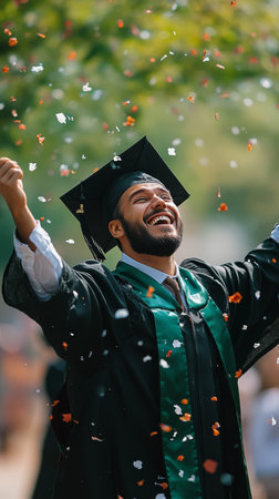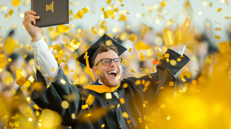 Joyful graduate cheers as colorful confetti falls during a memorable ceremony, celebrating their significant academic achievement and inspiring journey